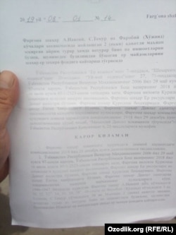 Озодликка Фарғона шаҳар ҳокими имзолаган қарор нусхаси йўлланган.