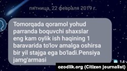 “Ушбу смс Ўзбекистон бўйича барча операторлар провайдерлари орқали ҳаммага жўнатилди”, деди Пенсия жамғармаси мулозими ўзини таништирмаган ҳолда.