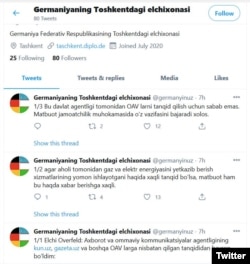27 ноябрь куни Германиянинг Ўзбекистондаги элчихонасига оид Twitter акаунтида элчи Gunter Overfeldнинг АОКА ва маҳаллий нашрлар ўртасидаги зиддиятга муносабати эълон қилинди.
