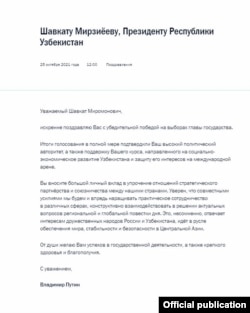 Кремль матбуот хизмати 25 октябрь куни Москва вақти билан соат 12 да эълон қилган бу табрикнома матни Россия президенти расмий сайтида ҳанузгача турганини кўриш мумкин: